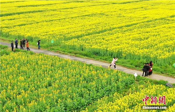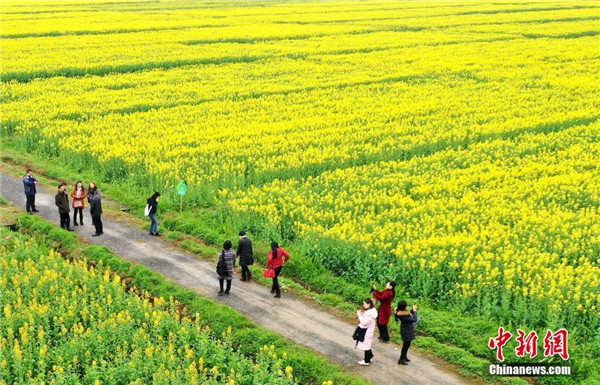 3月2日,江西省吉水縣烏江鎮(zhèn)楓坪千畝油菜花基地油菜花盛開,許多游客前來觀賞拍照徜徉在花海中。郭弘毅 攝