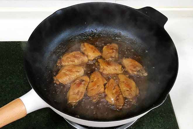 10.燉好后,開(kāi)大火收汁,完全收干,讓醬汁在雞翅上掛住。