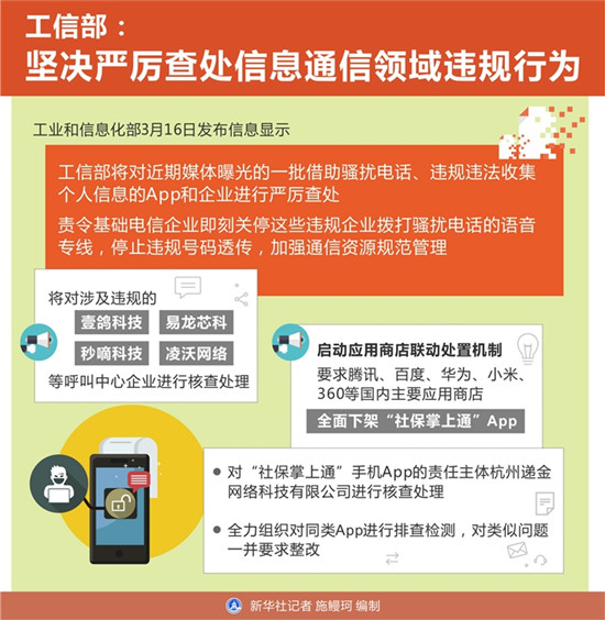據(jù)了解,工信部將對涉及違規(guī)的壹鴿科技、易龍芯科、秒嘀科技和凌沃網(wǎng)絡(luò)等呼叫中心企業(yè)進(jìn)行核查處理。同時(shí),啟動(dòng)應(yīng)用商店聯(lián)動(dòng)處置機(jī)制,要求騰訊、百度、華為、小米、360等國內(nèi)主要應(yīng)用商店全面下架“社保掌上通”App,對“社保掌上通”手機(jī)App的責(zé)任主體杭州遞金網(wǎng)絡(luò)科技有限公司進(jìn)行核查處理,并全力組織對同類App進(jìn)行排查檢測,對類似問題一并要求整改。