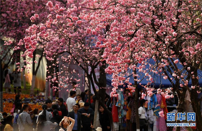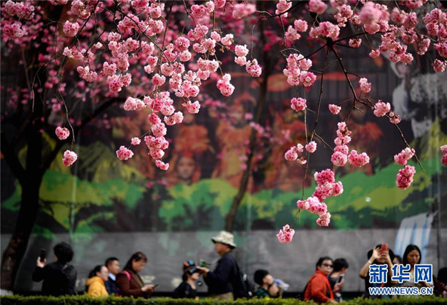 游人在昆明圓通山公園觀賞盛開的櫻花(3月16日攝)。新華社記者 藺以光 攝