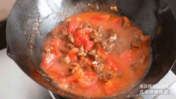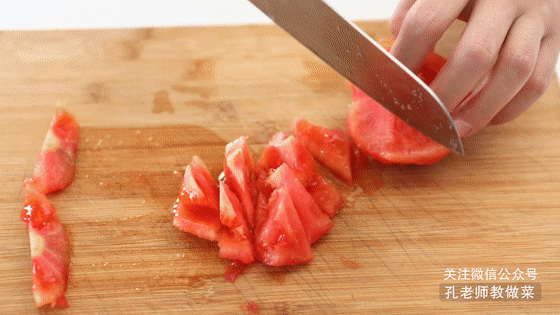 5.鍋中適量油燒熱,下入番茄塊翻炒至出汁。(將番茄去皮做出來(lái)口感更好,在番茄頂部輕劃“十”字,放入熱水鍋中煮2-3分鐘,煮至表皮褶皺裂開(kāi),取出番茄晾涼后就可以輕易的撕下外皮了。)