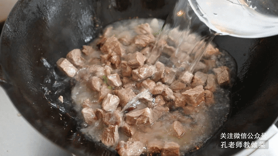 6.倒入牛腩塊,加一大碗清水,調(diào)入白糖和鹽,大火煮開(kāi)后轉(zhuǎn)小火煮約30分鐘,煮至用筷子輕易戳透牛腩即可。
