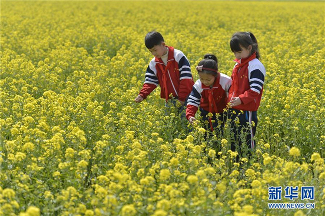 3月26日,幾名小學(xué)生在河北省沙河市東葛泉村油菜花田內(nèi)玩耍。