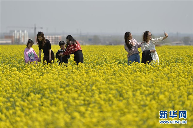 3月26日,游客在河北省沙河市東葛泉村油菜花田內(nèi)游覽。