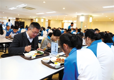 北京市陳經(jīng)綸中學(xué)高中校區(qū)的食堂開設(shè)了七八個窗口,為學(xué)生配備了不同套餐,每日的菜單都在食堂內(nèi)公示。校長牟成梅幾乎每天中午都在食堂用餐,牟成梅回憶,從她來到學(xué)校時校內(nèi)就有陪餐制度,這一傳統(tǒng)至少延續(xù)了兩年多。