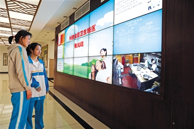 海淀教師進(jìn)修學(xué)校附屬實(shí)驗(yàn)學(xué)校(北校區(qū))大屏幕實(shí)時直播后廚情況。 新京報(bào)記者 王遠(yuǎn)征 攝