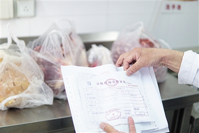 安樂幼兒園食堂管理員查驗(yàn)動物檢疫合格證明等。新京報(bào)記者 馮琪 攝