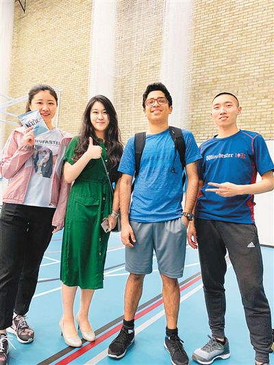在南安普頓大學主校區(qū)的體育館,王子君(左二)剛參加完乒乓球比賽。