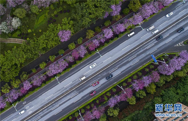 4月14日,在廣西柳州市學(xué)院路,車輛在開(kāi)滿洋紫荊的街道上行駛(無(wú)人機(jī)拍攝)。