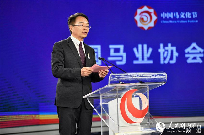 中國(guó)馬業(yè)協(xié)會(huì)副會(huì)長(zhǎng)蔡猛發(fā)布第二屆中國(guó)馬文化節(jié)暨首屆內(nèi)蒙古國(guó)際馬文化博覽會(huì)總體情況。