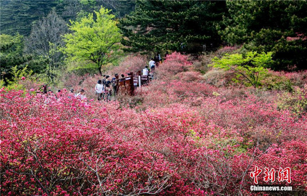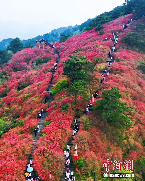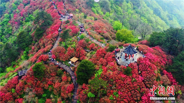 4月20日,游客在龜峰山的杜鵑花海游玩。近日,湖北省麻城市龜峰山的古杜鵑花盛開,大量游客前來賞花觀景。中新社記者 張暢 攝