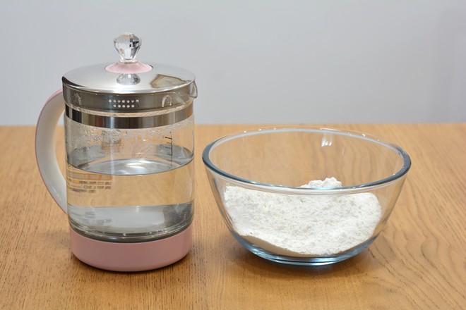 1.中筋面粉和開水準(zhǔn)備好,開水晾幾分鐘,溫度在80-90度最好;