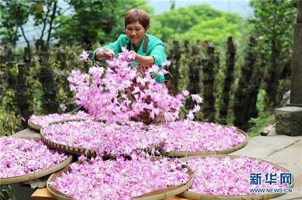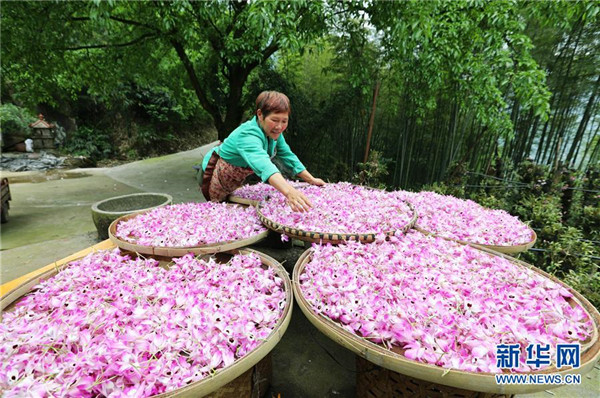 5月4日,在貴州省赤水市白云鄉(xiāng)平灘村,農(nóng)戶(hù)在晾曬剛采摘的金釵石斛鮮花。