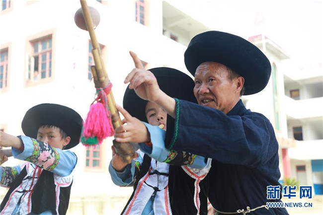 5月14日,在畢節(jié)市黔西縣協和鎮(zhèn)立新村立新小學,孩子們在老師的指導下學習蘆笙。新華社發(fā)(周訓超 攝)