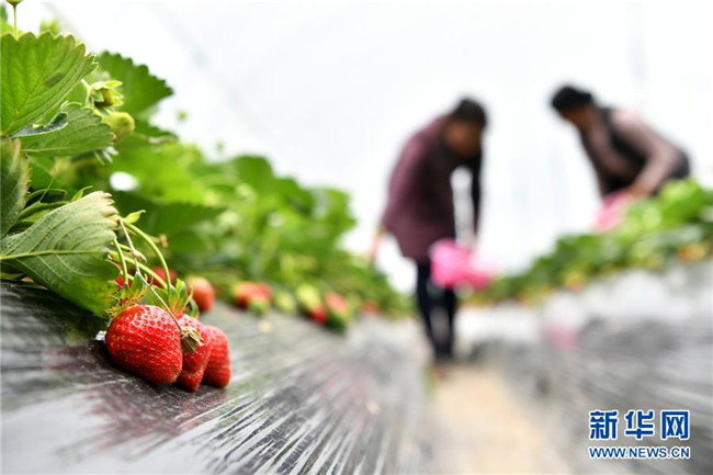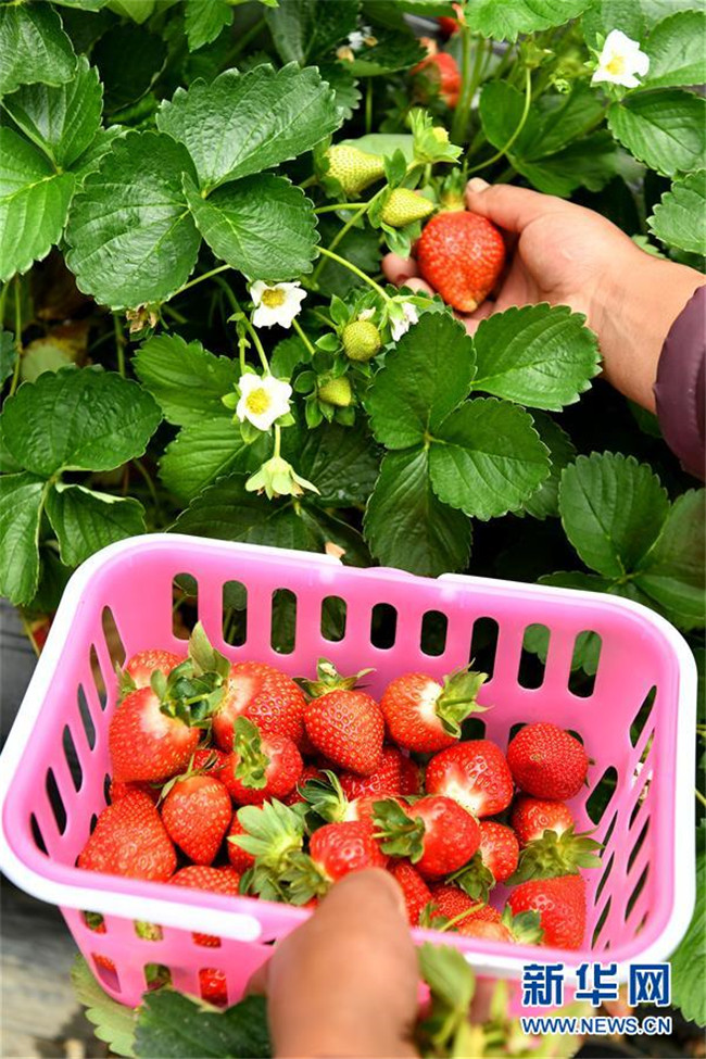 5月14日,久巴村村民在大棚里采摘草莓。新華社記者 李鑫 攝