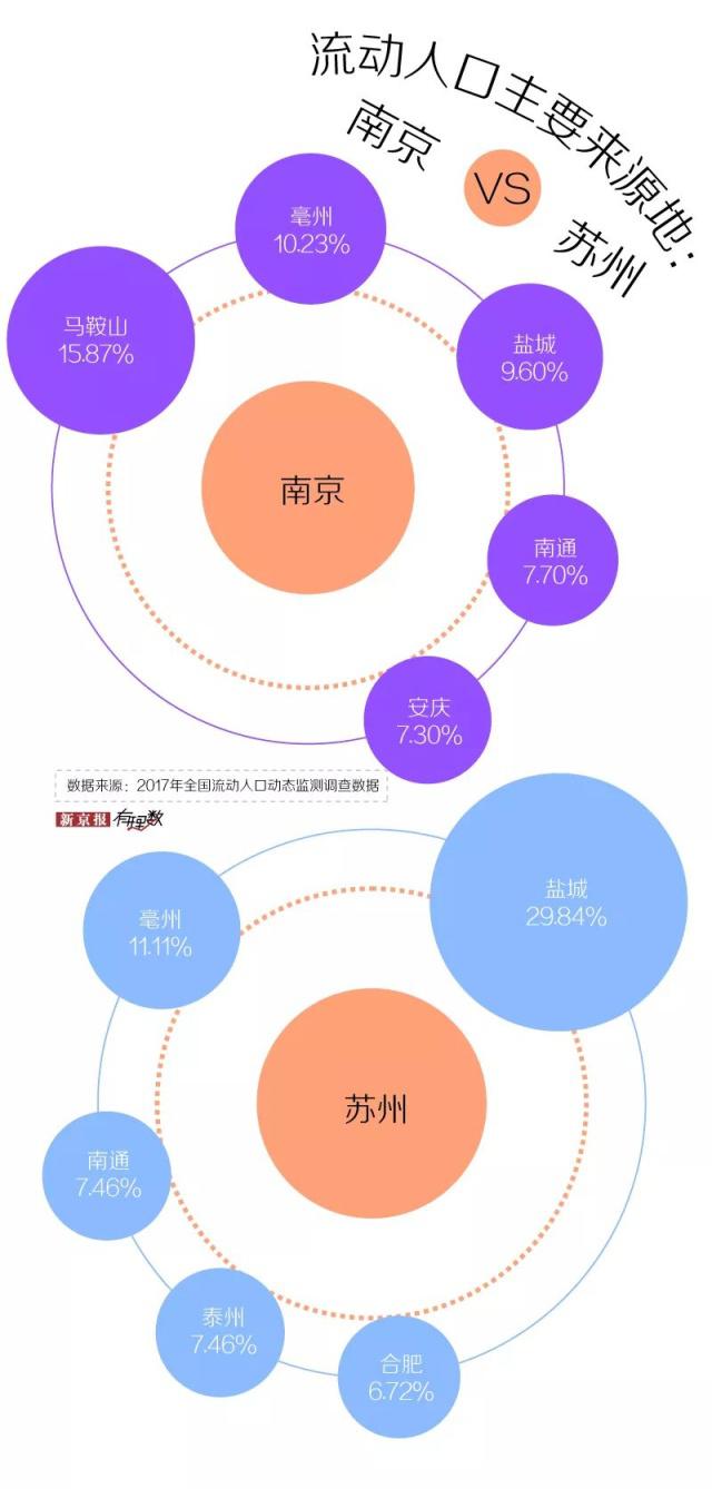 根據(jù) 2017 年全國(guó)流動(dòng)人口動(dòng)態(tài)監(jiān)測(cè)調(diào)查數(shù)據(jù),南京流動(dòng)人口的第一來源地是馬鞍山,前五大來源地中有三個(gè)是安徽的城市;蘇州流動(dòng)人口的第一來源地是鹽城,前五大來源地本省占了三個(gè)。