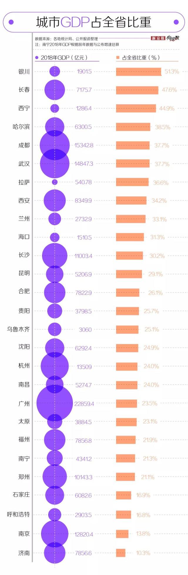 我們梳理了 27 個(gè)省和自治區(qū) 2018 年的地區(qū)生產(chǎn)總值后發(fā)現(xiàn),目前西藏、青海、寧夏、海南、甘肅五地 GDP 未破萬億,所以相應(yīng)的拉薩、西寧、銀川、海口、蘭州留給大家的記憶點(diǎn)可能不多;而像江蘇、山東兩地 GDP 可以排在全國(guó)前十,但其省會(huì)城市南京、濟(jì)南的 GDP 占全省比重不到 15%。