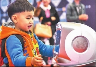 首屆新疆智能產(chǎn)業(yè)博覽會上,小朋友在與一款智能機器人互動。新華社發(fā)