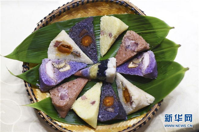 五彩粽是當?shù)匕傩站偷厝〔?,把不同植物分別搗成黑、紫、黃、紅四種顏色的湯汁,再用湯汁把糯米上色,與白色的糯米一起用粽葉包制而成。五彩粽色彩艷麗、香軟可口,受到當?shù)匕傩蘸陀慰偷南矏邸?/div>