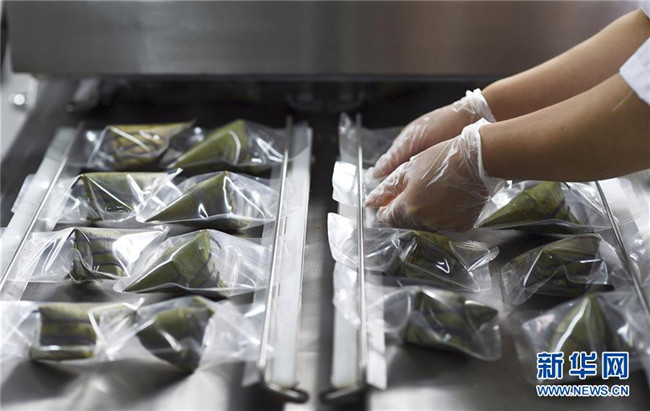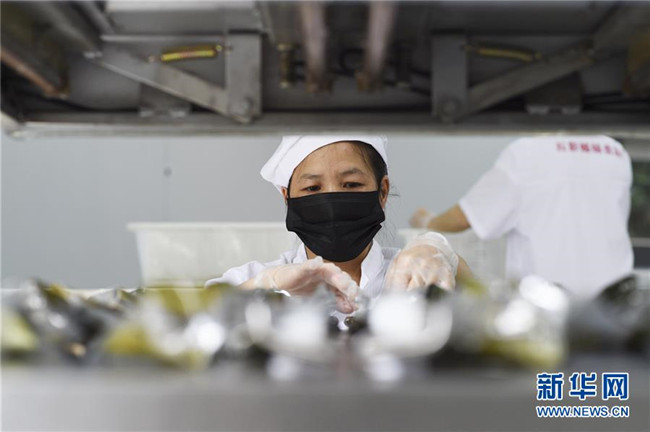 6月2日,在臺江縣一家食品生產(chǎn)企業(yè)車間,工人將煮熟的五彩粽進行真空包裝。 新華社發(fā)(劉開福 攝)