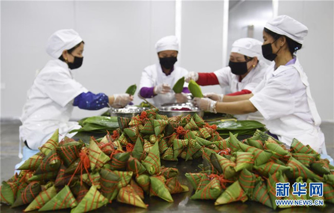 6月2日,在臺江縣一家食品生產(chǎn)企業(yè)車間,工人在包制五彩粽?!⌒氯A社發(fā)(劉開福 攝)