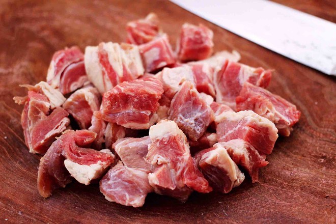 9.這個(gè)時(shí)候放入焯水的牛肉塊,大火翻炒片刻。