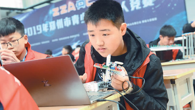3月31日,2019年鄭州市青少年機器人競賽首次將線上創(chuàng)意編程比賽納入競賽中。圖為選手在比賽前編程。張 濤攝(人民視覺)