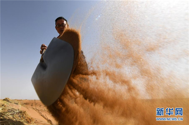 在庫(kù)布其沙漠中的白土梁林場(chǎng)沙棘林內(nèi),林場(chǎng)管理員鄧勝利展示沙棘樹剪枝育苗技術(shù)(2018年8月1日攝)。當(dāng)?shù)赝ㄟ^種植沙棘,既解決了荒漠化問題,又幫助農(nóng)牧民增收,實(shí)現(xiàn)了生態(tài)和經(jīng)濟(jì)雙重效益。 新華社記者 張善臣 攝