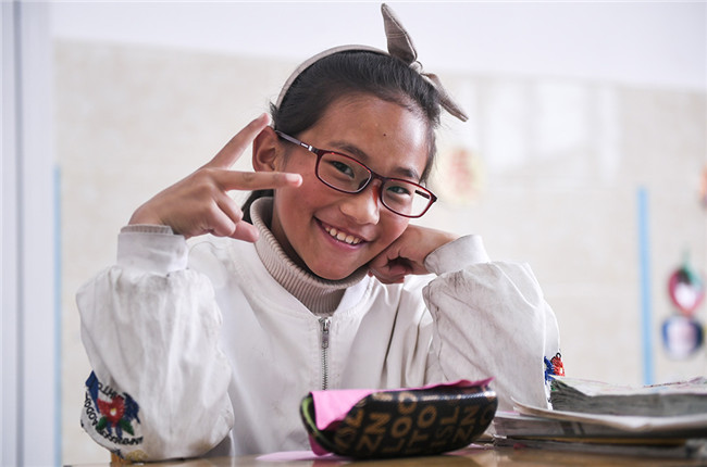 6月18日,戴上眼鏡的扎西旺姆在若爾蓋縣民族寄宿制小學的教室里。