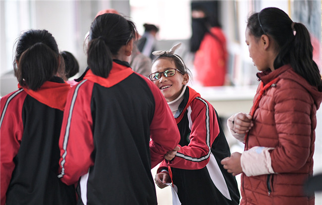 6月17日,在若爾蓋縣中學,配完眼鏡的扎西旺姆與同學們聊天。