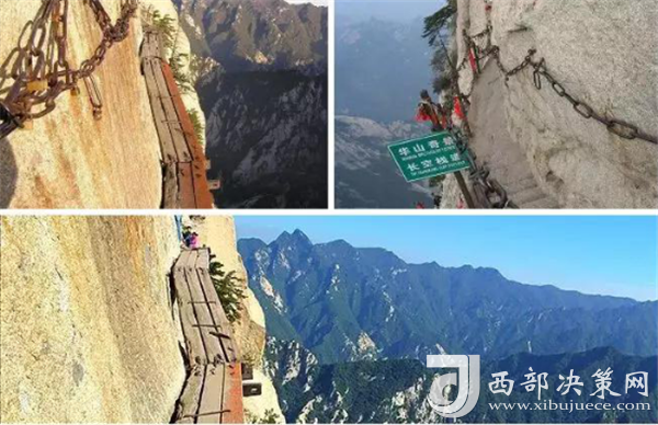 長空棧道位于華山南峰東側(cè)山腰,是華山派第一代宗師元代高道賀志真為遠(yuǎn)離塵世靜修成仙,在萬仞絕壁上鑲嵌石釘搭木椽而筑。棧道上下皆是懸崖絕壁,鐵索橫懸,由條石搭成尺許路面,下由石柱固定,游人至此,面壁貼腹,屏氣挪步,被譽為“華山第一天險”。由于棧道險峻,故當(dāng)?shù)厝擞?ldquo;小心九厘三分,要尋尸首,洛南商州”之說。這里只是探險之道,并非登山必由之路,膽小人就在升表臺看看也就行了。所以石刻上不少警告之語:“懸崖勒馬”等。