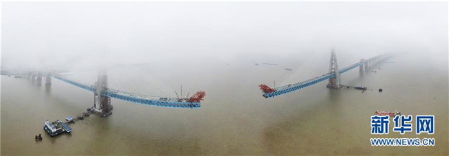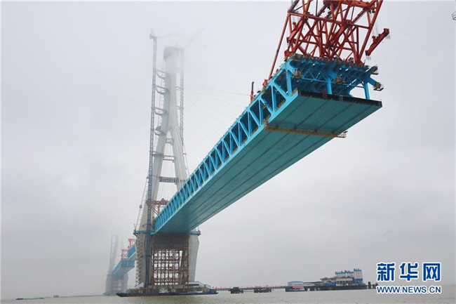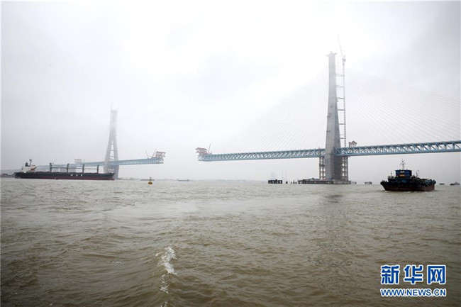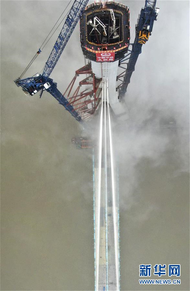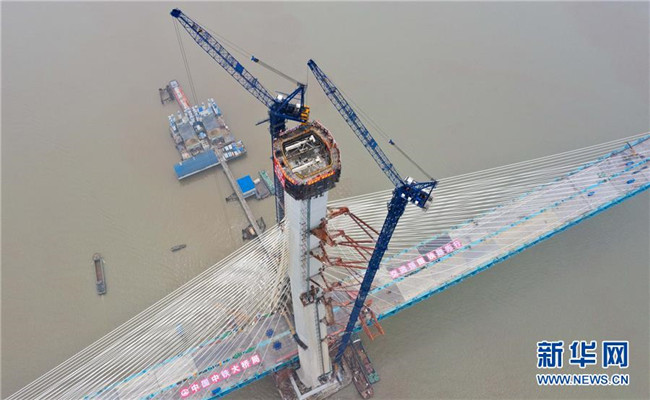 當日,滬通長江大橋南主塔順利封頂。至此,該橋兩座高達330米的主塔全部建成,標志著世界最大跨度公鐵兩用斜拉橋建設(shè)取得了關(guān)鍵性進展。滬通長江大橋全長11072米,主橋長2296米,主跨1092米,是滬通鐵路全線的控制性工程,設(shè)計為上層6車道高速公路,下層4線鐵路。新華社發(fā)(許叢軍攝)