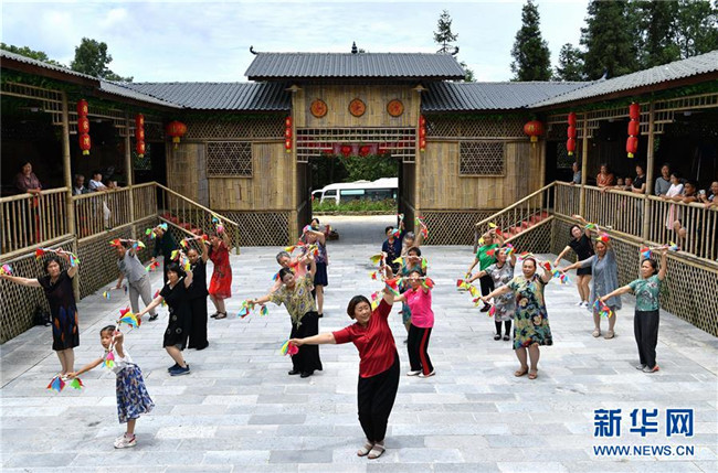 7月1日,游客在湖北省恩施土家族苗族自治州宣恩縣珠山鎮(zhèn)車洞坪民宿旅游區(qū)體驗土家族“八寶銅鈴舞”。新華社發(fā)(宋文 攝)