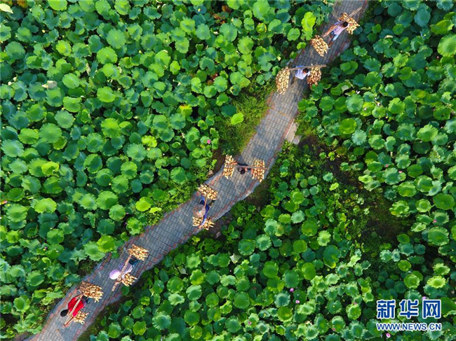 7月10日,在柳州市柳江區(qū)百朋鎮(zhèn),農(nóng)民挑著剛剛采收的蓮藕走在藕田里(無人機(jī)拍攝)。新華社記者 黃孝邦 攝