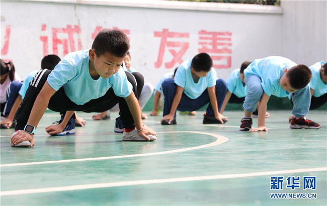 “小候鳥”們在武術(shù)課前做熱身運動(7月15日攝)。