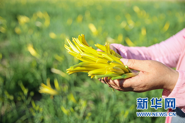 一位村民向記者展示剛剛采摘下來的黃花菜(7月4日拍攝)。 新華網 肖寒 攝