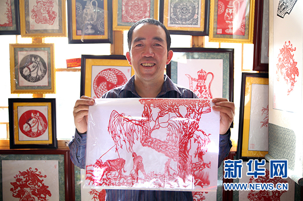 紅崖老巷子民俗村“剪紙情郎”楊國權向記者展示剪紙作品。 新華網 肖寒 攝