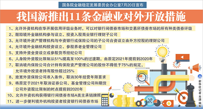 國(guó)務(wù)院金融穩(wěn)定發(fā)展委員會(huì)辦公室20日對(duì)外宣布,為貫徹落實(shí)黨中央、國(guó)務(wù)院關(guān)于進(jìn)一步擴(kuò)大對(duì)外開(kāi)放的決策部署,按照“宜快不宜慢、宜早不宜遲”的原則,在深入研究評(píng)估的基礎(chǔ)上,推出以下11條金融業(yè)對(duì)外開(kāi)放措施: