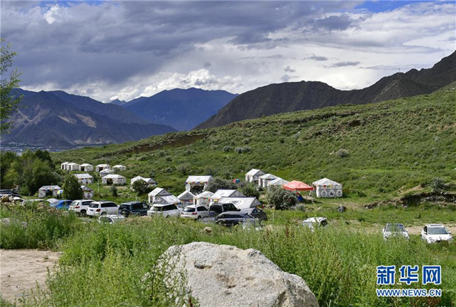 這是達東村景區(qū)的帳篷和旅游車輛(7月20日攝)。西藏拉薩市柳梧鄉(xiāng)達東村是一個千年古村,也曾是一個貧困村。近年來,依托秀美的自然風(fēng)光、深厚的歷史文化和淳樸的風(fēng)土人情,當(dāng)?shù)卣畬嵤┪幕糜萎a(chǎn)業(yè)精準(zhǔn)扶貧,使達東村蛻變成為鄉(xiāng)村旅游勝地。新華社記者張汝鋒攝