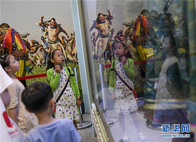 在新疆博物館的講解結(jié)束后,一名小游客通過(guò)電話手表和文藝揚(yáng)(右)合影留念(8月8日攝)。 新華社記者 王菲 攝