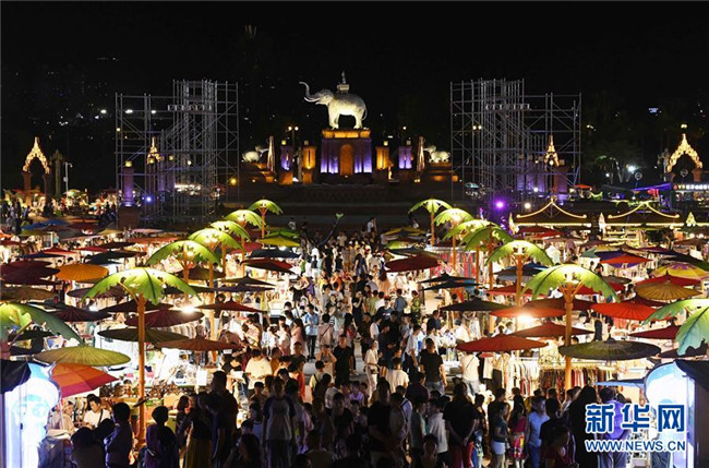 8月16日,在西雙版納傣族自治州景洪市,游客在瀾滄江畔的夜市休閑購(gòu)物。新華社記者 楊宗友 攝