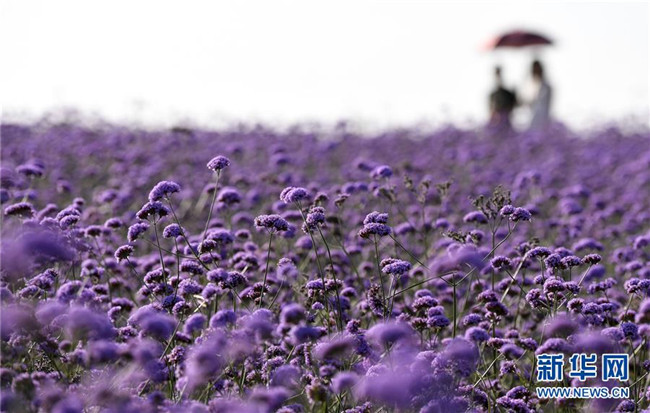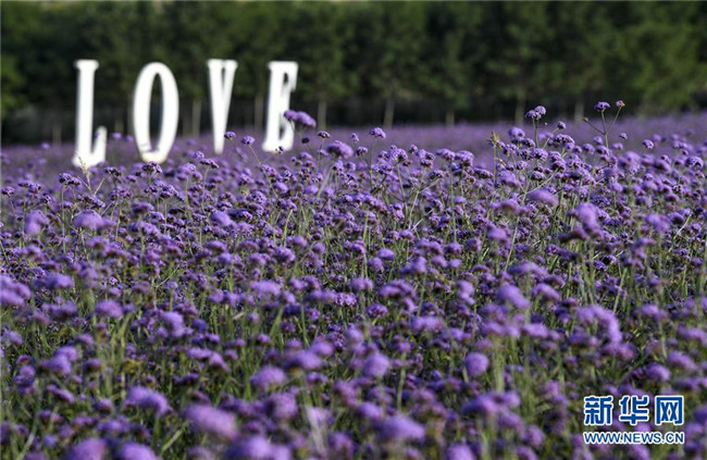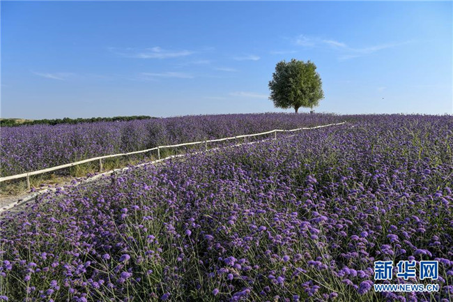 寧夏艾伊薰衣草生態(tài)基地內(nèi)大片馬鞭草競相開放(8月17日拍攝)。