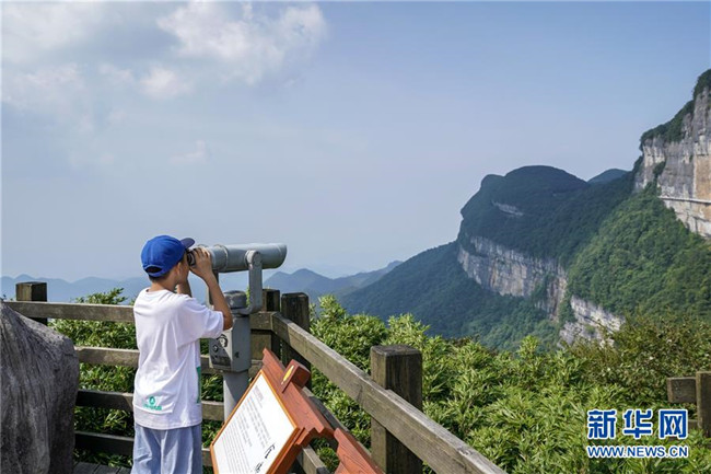 游客在重慶金佛山風(fēng)景區(qū)用望遠(yuǎn)鏡觀景(8月20日攝)。重慶市南川區(qū)的金佛山風(fēng)景區(qū)屬典型的喀斯特地貌,風(fēng)景秀美,吸引了不少游客。新華社記者劉潺攝
