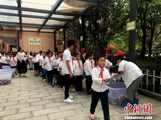 學校為學生準備了營養(yǎng)餐,學生排隊領?!垙?攝