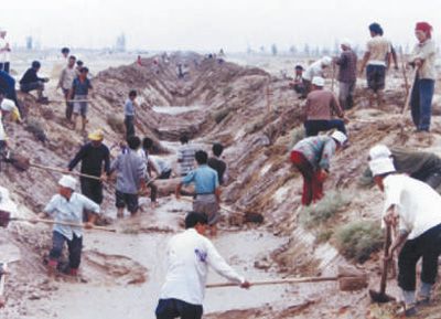 永寧縣閩寧鎮(zhèn)建設(shè)初期,群眾在進行農(nóng)田水利建設(shè)。攝于1997年7月。新華社發(fā)