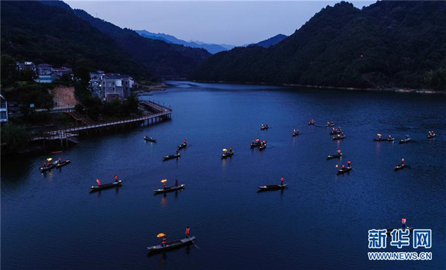 9月25日,在宋村鄉(xiāng)云源港的水面上,漁民劃著漁船,船頭點亮漁燈,構(gòu)成一幅“漁舟唱晚、萬家燈火”的美麗圖景,與沿湖民宿群落交相輝映(無人機拍攝)。