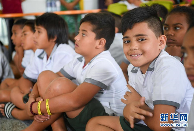 10月26日,在庫克群島首都阿瓦魯阿的阿皮尼考學校,小學生欣賞中國交響樂團演奏家的表演。