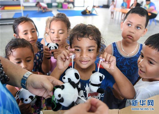 10月26日,在庫克群島首都阿瓦魯阿的阿皮尼考學校,幼兒園的孩子手拿來自中國的熊貓掛件。