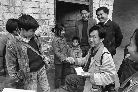 1996年5月,河南省新縣王里河村,攝影記者解海龍和范明珠(左三)握手。趙新喜/攝