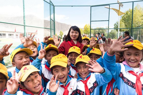 2019年10月21日,西藏自治區(qū)拉薩市曲水縣達嘎鄉(xiāng)其奴村,蘇明娟和“大眼睛希望小學”的學生們合影。
